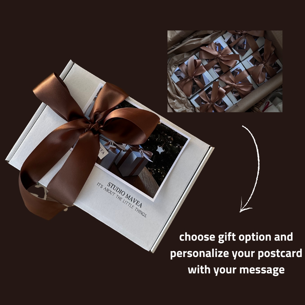 Die Produkte werden in einer klassischen Box geliefert und mit einer Schleife aus Satin versehen. Die Farbe des Bandes wird schlicht gehalten (Gold, Kupfer, Dunkelbraun) und verleiht deinem Geschenk eine edle Note.